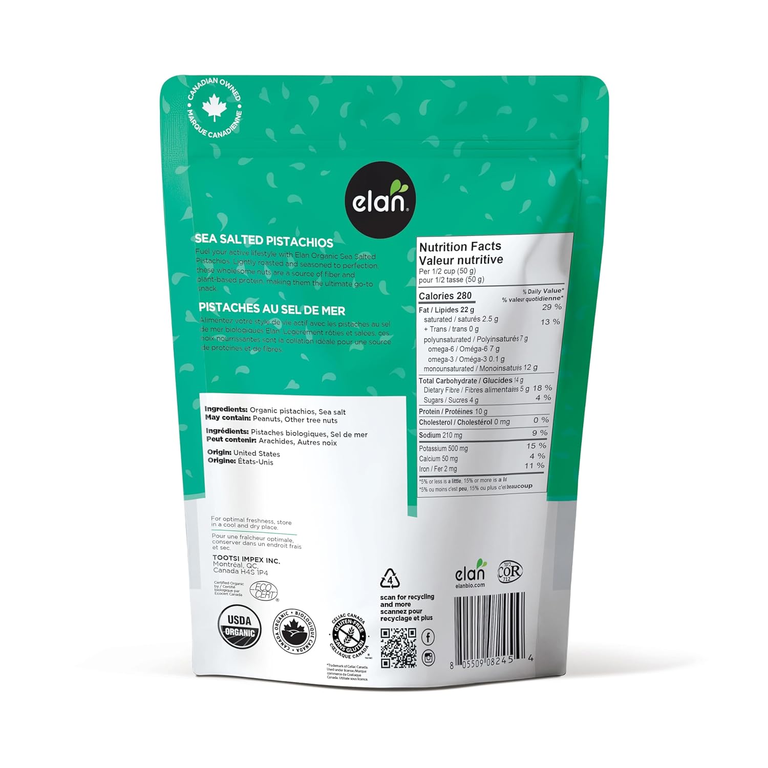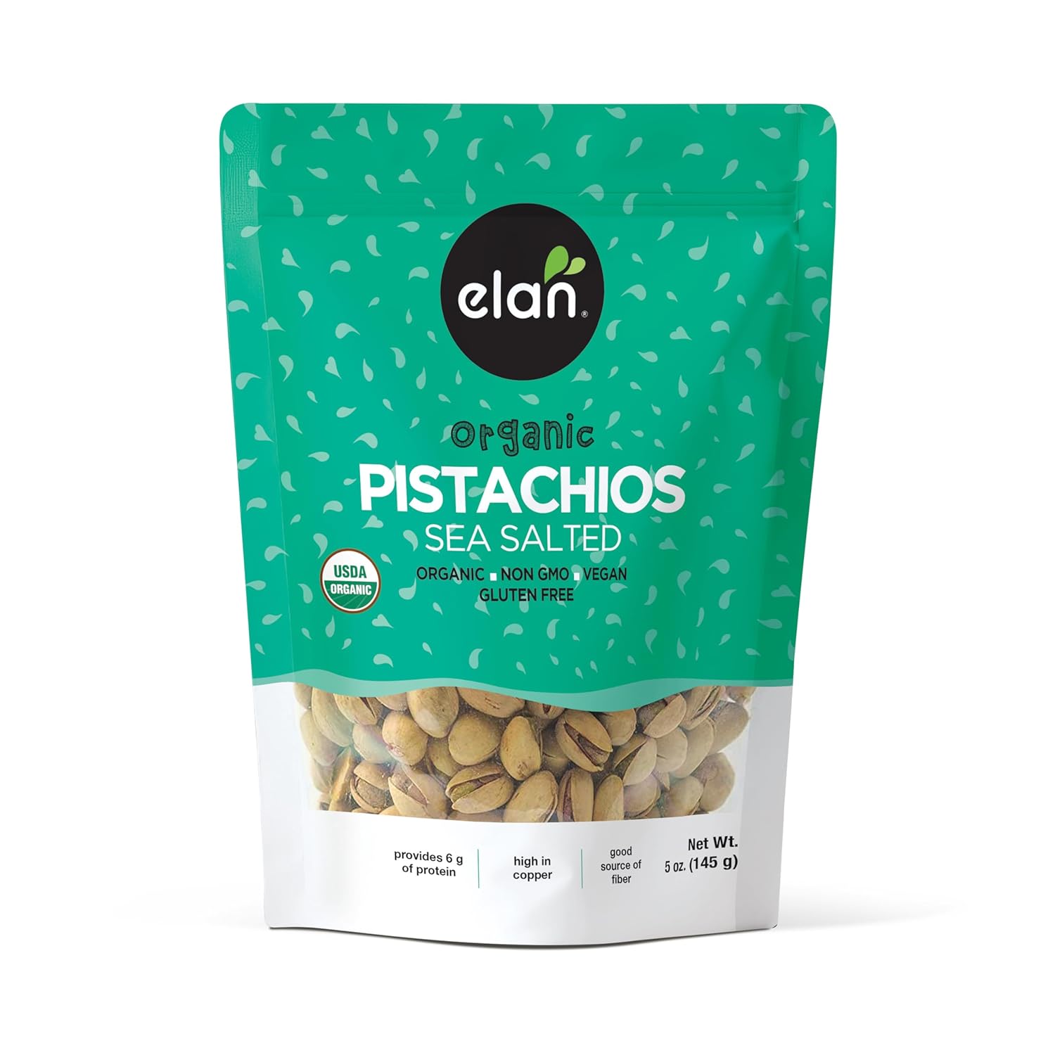 Elan Organic Sea Salted Pistachios, 5.1 oz, In Shell, Salted with Sea Salt, Lightly Roasted, Naturally Open, Non-GMO, Vegan, Gluten-Free, Kosher, Healthy Snacks (Pack of 4)